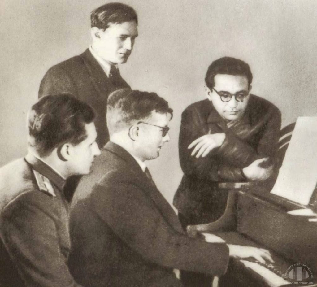 В классе Дмитрия Шостаковича. Слева направо: Кара Караев, Дмитрий Шостакович, Герман Галынин, Евгений Макаров