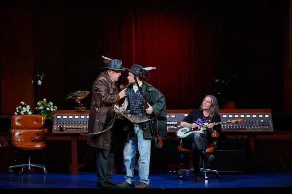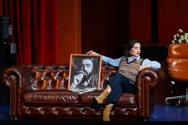 С другой стороны, чтобы «Вольный стрелок» совсем не превратился в драматический спектакль с музыкальными номерами, современному композитору Олегу Гудачеву заказали «аккомпанемент» в духе клубной музыки, которая идет фоновой подложкой к разговорам. Гудачев вполне справился с задачей, где-то ограничившись двумя-тремя переборами электрогитары, где-то вкрапив в эти квази-импровизации мотивы из Вебера. Все это исполнял вживую специально приглашенный рокер Тимофей Дроздов – Самиэль (немецкий фольклорный аналог дьявола), активно сновавший с гитарой по сцене и звуками маркировавший свое постоянное присутствие даже там, где его по сюжету не должно было быть.