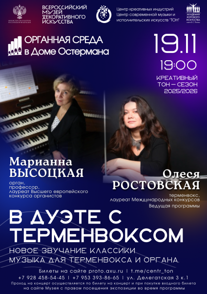 19 ноября в концертном зале Центра современной музыки и исполнительских искусств “Тон” на площадке Всероссийского музея декоративного искусства, в историческом особняке графа Остермана, состоится концерт, где соединяться два высокотехнологичных инструмента. Орган, название которого с древнегреческого переводится как «машина, орудие», и терменвокс, звук которого возникает буквально из воздуха, благодаря магическим жестам рук. Этот музыкальный инструмент, изобретенный инженером Львом Терменом, представляет собой небольшой ящик с двумя антеннами; исполнитель при игре на нем ни к чему не прикасается, а, словно дирижер, водит руками в воздухе рядом с антеннами. При этом инструмент начинает петь удивительным неземным голосом, который в то же время очень похож на человеческое пение. Правая рука при этом изменяет высоту тона (чем ближе рука подносится к правой антенне, тем выше тон), а левая – удалением и приближением руки к другой антенне контролирует громкость звука. Более того, инструмент воспринимает малейшие движения всего тела исполнителя, небольшой поворот головы или даже естественные движения тела, связанные с дыханием. Именно поэтому голос терменвокса и является таким живым, а выразительность профессионального исполнения на нем поражает воображение.