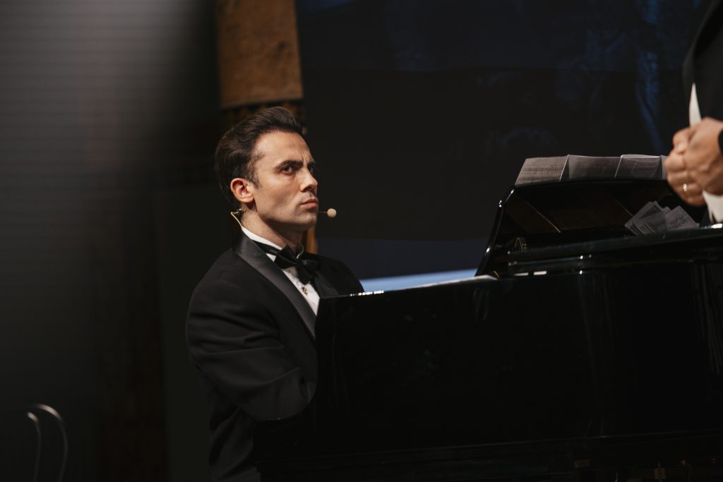Его достойным партнером в образе Рахманинова стал Дмитрий Крюков – главный дирижер Госоркестра республики Башкортостан. Выбор, на первый взгляд, неожиданный, но абсолютно оправдавший себя. У Дмитрия за плечами огромная практика пианиста-концертмейстера в Госкапелле Валерия Полянского, его учителя. А в Уфе он планомерно занимается просветительством, как ведущий предваряет свои оркестровые программы – так что говорить со сцены ему не впервой. Тандем двух успешных в своей карьере артистов был очень правильным и обеспечил равноправие Крюкова и Тихомирова, а значит – Рахманинова и Шаляпина. Они репетировали на наших глазах, концертировали, смеялись, спорили – пронеслась целая жизнь, наполненная радостью, искусством, восхищением талантами друг друга. И даже краткие недомолвки, «облака», порой набегавшие, существенно не влияли на эту удивительную дружбу. Звучание голоса и фортепиано время от времени дополнял Струнный квартет имени Римского-Корсакова, «подкрашивая» и оттеняя дуэт главных героев (их неожиданное включение в финал Каватины Алеко дало эффект оркестрового нарастания, необходимого в данном контексте).