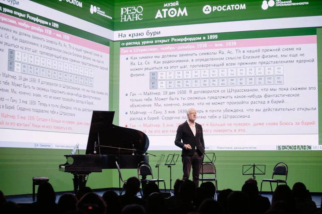 Открытие фестиваля «Резонанс», которое пришлось на конец октября, было интригующим. Вход исключительно по приглашениям. В фойе гостям надевали бумажные браслеты и, объединив в малые группы, отправляли по экскурсионному маршруту. На минус третьем этаже можно было увидеть макет советской атомной бомбы, а в экспозициях первого этажа переместиться в условное «настоящее атомной отрасли» и лицезреть эффектную инсталляцию «поющего атомного реактора», музыка для которого была написана при помощи искусственного интеллекта. После такого экскурсионного квеста гости объединялись в конференц-зале на две с половиной сотни мест, чтобы услышать пламенную речь доктора физико-математических наук Алексея Семихатова о научных достижениях начала XX века, а затем окунуться в изыски камерной музыки в исполнении артистов Нижегородского театра оперы и балета, десантировавшихся в столице на один вечер исключительно для этого выступления.