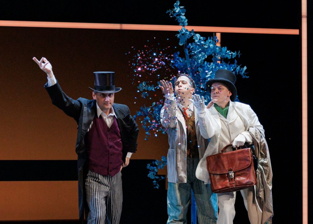 Кирилл Шмаков написал новое либретто, отчасти избавившее драматургию от ряда запутывающих узлов ради скорейшего движения к финалу, который получился двойным, произведя эффект бонуса в виде еще одного маленького спектакля с полным хеппи-эндом. Финал-обманка нешуточно закрыл занавес, возмутив несправедливостью, когда Виолетта, безнадежно влюбленная в художника Рауля, осталась совсем одна, словно сбитая с ног вихрем марша-тарантеллы «Карамболины» – звездного номера королевы карнавала Нинон. Справедливость восторжествовала, когда эта скромная Виолетта, она же Фиалка, внезапно заменила капризную Нинон, отказавшуюся выходить на сцену: второй финал явил новую звезду театра «Одеон», которой уже ничего не стоило заполучить в объятья красавца Рауля. Динамику спектакля с новым сценарием тем не менее тормозили разговорные сцены, несмотря на гиперстарательную игручесть «коверных» в лице богемной братии. Паясничающим своего Флоримона сделал баритон Павел Назаров, неспроста принесший театру «Золотую Маску» за роль Тонио в «Паяцах», а на роль его закадычного друга Анри пригласили фирменного каскадника Романа Вокуева из Петербургской музкомедии. Но большинство разговорных диалогов у певцов, привыкших к оперному протоколу, получались морализаторскими, поучающими. Образец работы с актерской речью неожиданно явил бас Вадим Мокин в эпизодической роли без пения, виртуозно проартикулировав пьяную речь Париджи, требовавшего выкуп за Виолетту. Не подкачал и второй бас театра Александр Ватолкин в роли судебного пристава Пискачека, легко и непринужденно отработав мизансцены в духе французской комедии.