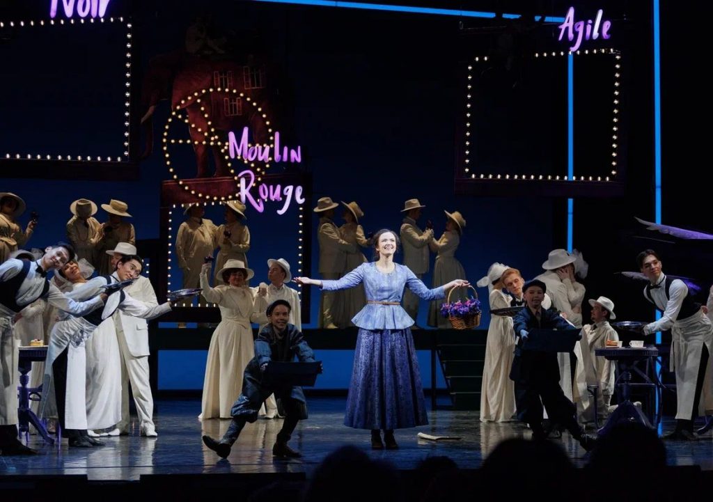 Режиссер карельской «Фиалки Монмартра» Анна Осипенко видела постановку этой оперетты в Санкт-Петербургском театре музыкальной комедии, созданную 80-летним Миклошем Синетаром в упадочно-осенних тонах, а потому свою первую «Фиалку» она справедливо решила наполнить огнями, прибегнув к помощи художника-постановщика Анвара Гумарова, знающего, как создавать «красоту из пустоты», и художника по свету Тараса Михалевского, наделяющего пространство сцены интеллектом. Вместе они сочинили туннель из Петрозаводска в Париж, построив его из светящихся несимметричных рам, а также создав еще и оптическую иллюзию подзорной трубы большой мощности. Плоскость сцены растянулась вглубь, подобно мехам французского аккордеона, позволив пространству дышать и вибрировать визуальными ассоциациями. В воздушном, отнюдь не перегруженном коллаже зеркала сцены силуэты картин импрессионистов и кубистов перемигивались с плакатными вырезками кабаре Chat Noir. На фоне светящихся рам представители парижской богемы, обитательницы Монмартра, дансерки Мулен Ружа в броских пестрых костюмах модниц и стиляг – творений художницы по костюмам Татьяной Ногиновой – словно выскакивали с полотен Мане, Пикассо, Тулуз-Лотрека, Модильяни.