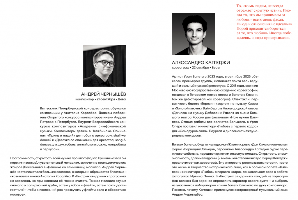 Самая ожидаемая часть – третья. Название «Быстрые свидания» предназначено именно ей, и оно говорит в том числе о встречах хореографов и композиторов. Их пары сложились на проекте «пиши балет», созданном в соавторстве театра «Урал Опера Балет» и Союза композиторов России. В социальных сетях театра выложены мини-интервью с хореографами, где они в полушутливом тоне рассказывают об опыте работы с композиторами. Александр Меркушев, например, поделился историей, как его напарник Роман Цыпышев практически за вечер поменял всю музыку. Каждый из хореографов подчеркнул, что писать для балета сегодня необходимо. «Урал Опере» можно только завидовать: ни один другой российский театр не заказывает балетные партитуры авторам с такой же регулярностью.
