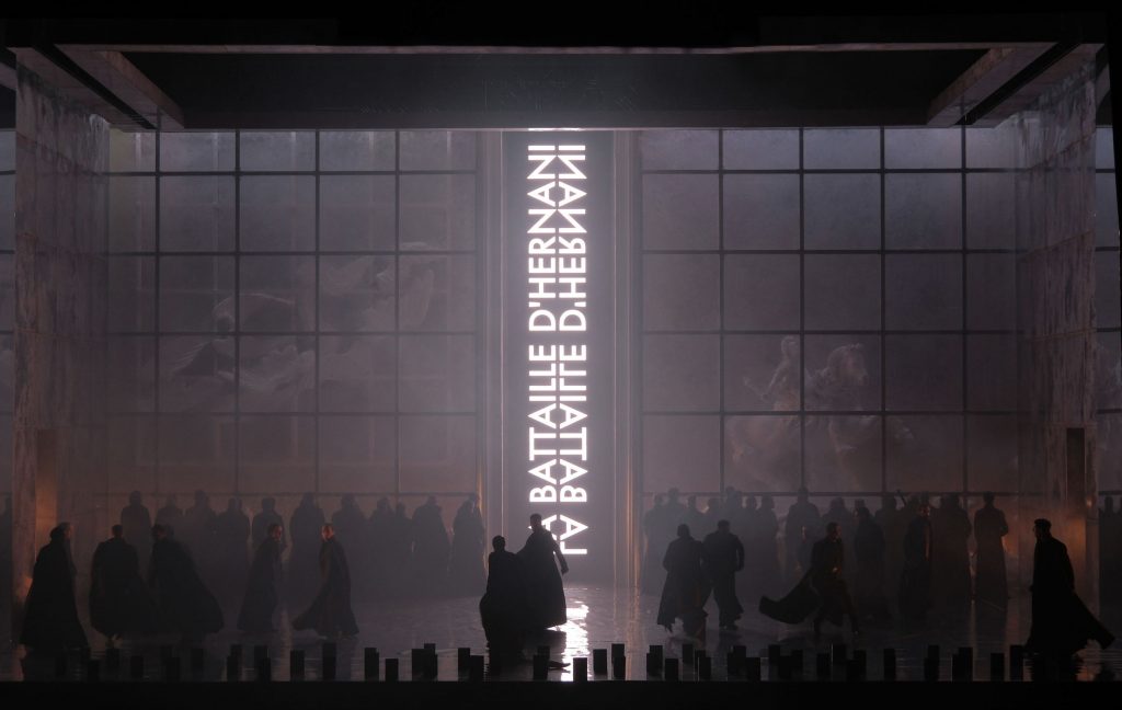 Чтобы публика случайно не перепутала, о какой опере речь, на заднике красуется надпись: La bataille d’Hernani. И, надо сказать, разного рода стычек, перестрелок и просто убийств на наших глазах происходит неимоверное множество – многочисленные артисты миманса и танцоры пребывают в постоянном движении (в том числе благодаря и вращающейся платформе).