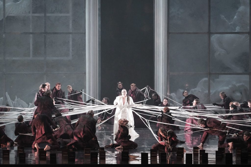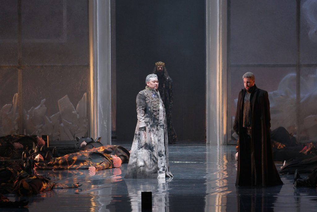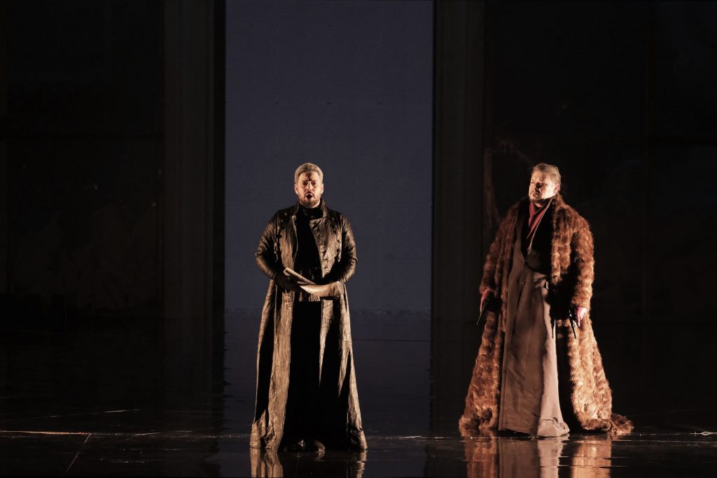 Красивые костюмы тончайшей работы – длинные плащи, почти идентичные для всех персонажей, за исключением цветовых вариаций, и перчатки, эффектная световая партитура – тоже фирменный знак театра Поды – вносят свой вклад в зрелищность спектакля. Жаль, что к драматургии оперы Верди он имеет самое отдаленное отношение.