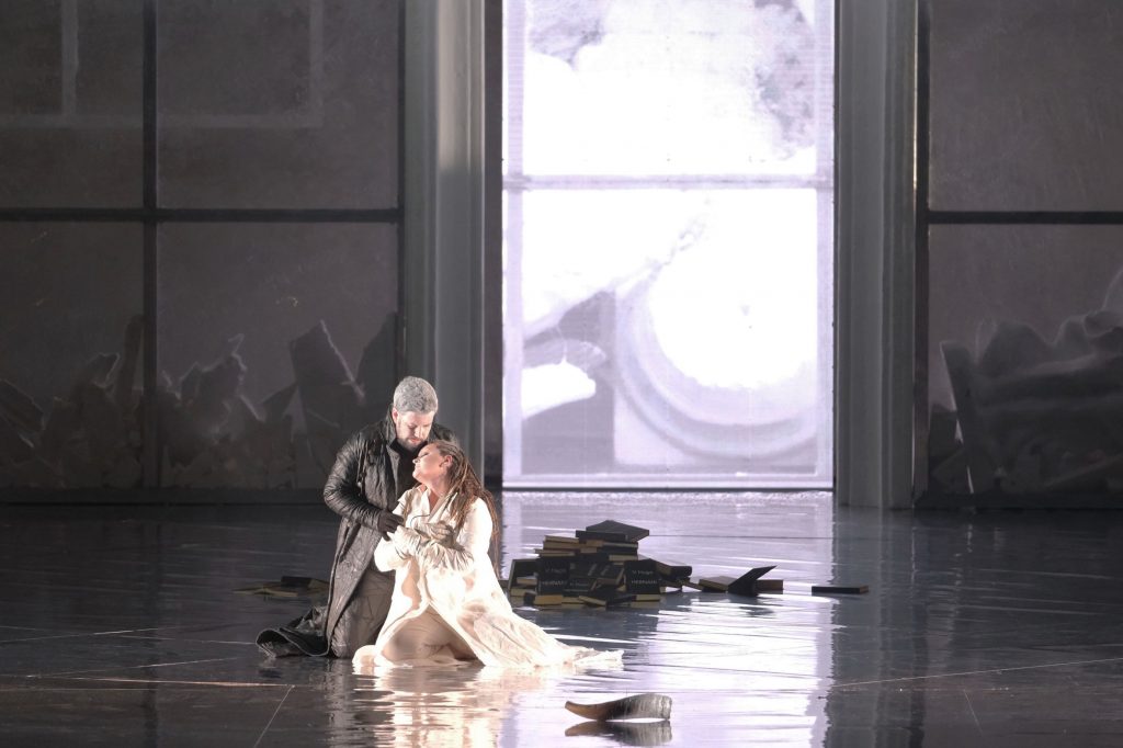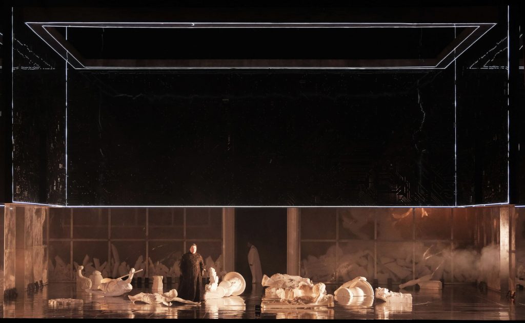 Сценическое пространство напоминает холл современного здания из стекла и металла, немного погодя в глубине за стеклом начинают просматриваться очертания античных статуй, а затем и их обломков, которые в третьем акте перекочуют прямо на сцену. Антагонист «старинного» – черный многогранник, пронизанный светящимися неоновыми элементами во втором акте, полностью скрывает стены (конструкция представляет собой коробку в коробке), а затем приподнимается, обнажая пустые пьедесталы и мраморные обломки. Третий куб – на этот раз прозрачный – появится в самом конце, по всей видимости, символизируя какое-то новое измерение, где перемещаются в медленном воинственном танце одетые в белое фигуры и куда Эрнани попадает перед смертью. Еще один символ, пронизывающий всю постановку, – книги. Сначала они расставлены в просцениуме, затем мы видим их в руках статистов, а в самом конце и главный герой почти не расстается с небольшим томиком.