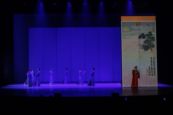 Состояла она из трех залов, и кураторы показа – драматург Ван Цзини и режиссер-постановщик Лю Бин – любезно сопроводили их своеобразной экспликацией. Перед каждым из трех условных актов на полупрозрачной кулисе выводились стихи о чудесном регионе. Сопровождал их распев в стиле традиционной поэзии Шу, перенося действие в эпоху Тан и раньше. И в целом по этим небольшим вступлениям можно было проследить всё немногочисленное оформление спектакля: свет, проекции, музыка, да штук девять высоких белых ширм на колесиках, на одной стороне которых приделаны крыши балконов в традиционном китайском «взлетающем» стиле. Но этого хватало с лихвой. Ширмы двигались, зонируя пространство или разбивая сцену на сегменты, создавая параллельность действия. Свет же выступал не столько в роли декорации, сколько одним из главных нарративных источников (раз уж российского зрителя лишили хоть какого-либо перевода – даже захудалого подстрочника). Он сообщал публике, кто на сцене, что за образ и куда смотреть, в конце концов. По окончании представления световик труппы, уставший не меньше танцовщиков, довольно смахивал трудовые капли, получив свою дозу аплодисментов.