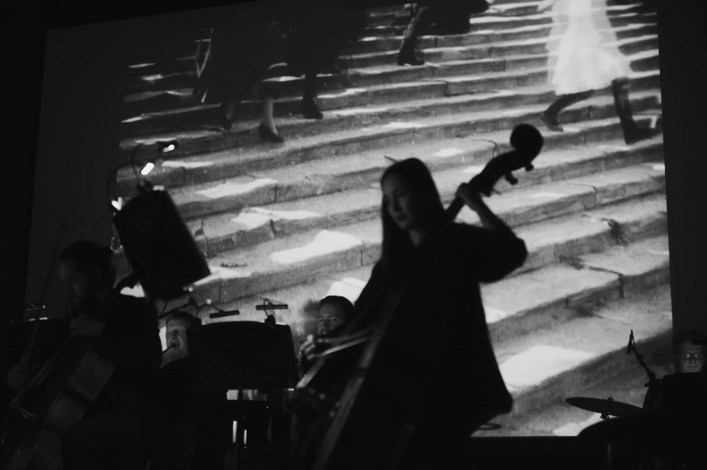 АС Мне было любопытно, но начинал я писать скептически и даже довольно агрессивно по отношению к мысли о киномузыке, потому что поначалу анонсировал фортепианный концерт. Писать пришлось прямо с эпизода «Одесская лестница», и тогда я понял, что это очень властный материал. Он почти по-бетховенски тяготящий, от него невозможно уклониться. Мне стало ясно, что здесь должна звучать киномузыка в хорошем смысле слова: быть не на первом плане и идти параллельно изображению, скромно выполняя свою функцию.