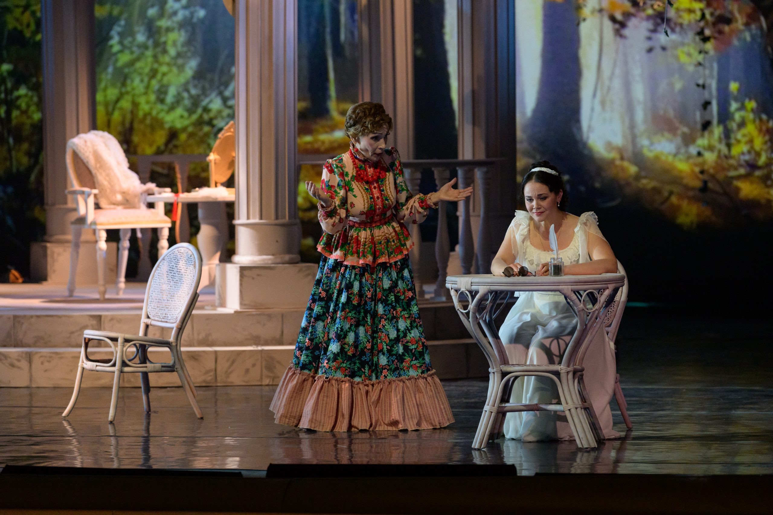 На одно из главных мест в своем спектакле Александров выводит няню Филиппьевну, персонажа обычно второстепенного. В его «Онегине» – это молодящаяся эксцентричная красавица а-ля Шарлотта Ивановна из «Вишневого сада», с тонкой талией и аристократической осанкой. Она постоянно пытается удостовериться в собственной красоте, любуясь собой в зеркале, много кокетничает с мужчинами, да и рюмашку водки может с легкостью тяпнуть – одним словом, с ней не соскучишься.