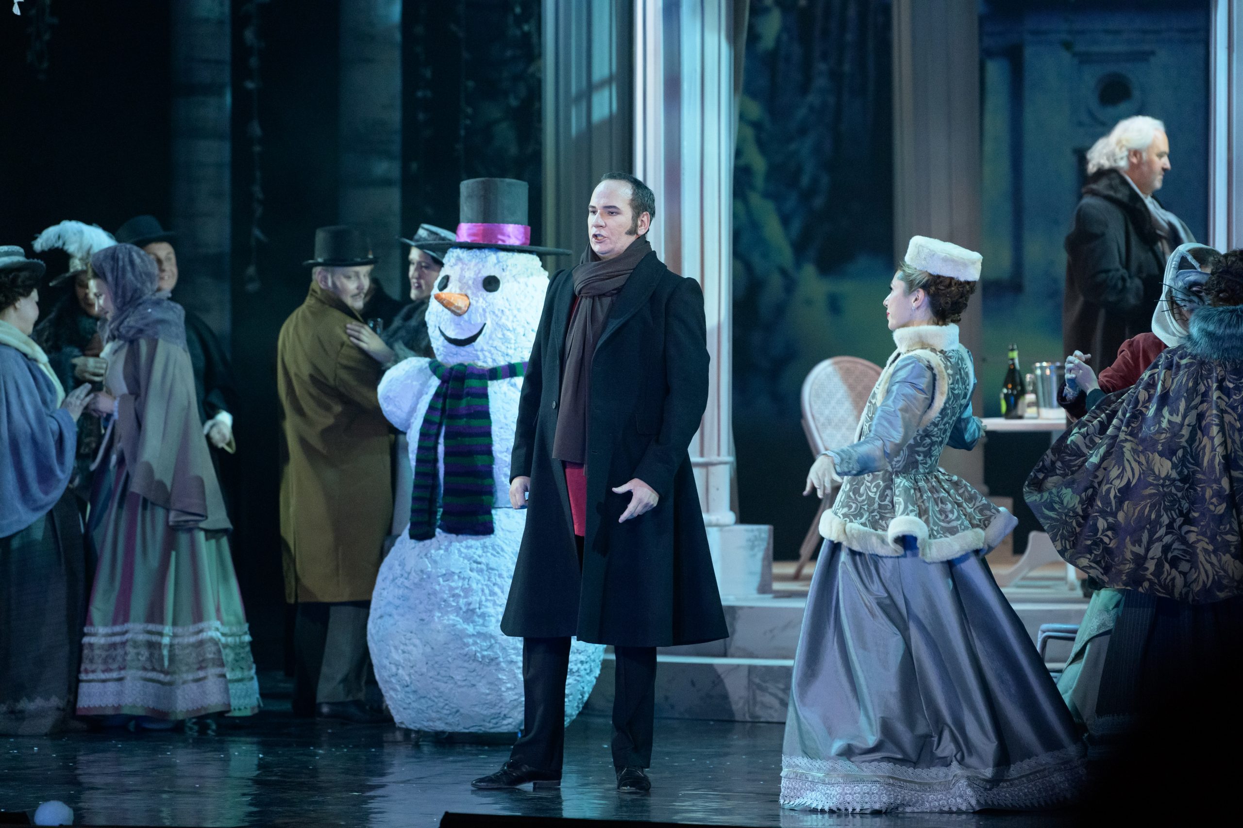 Березовая роща в первой картине, ночной парк во второй, берег осенней реки в третьей, зимний лес в сцене дуэли – вся эта красота появляется благодаря видеодекорациям. Даже сцена ларинского бала вынесена Окуневым за пределы дома – герои веселятся на открытом воздухе в парке при усадьбе, играя в снежки и распивая шампанское прямо на морозе.