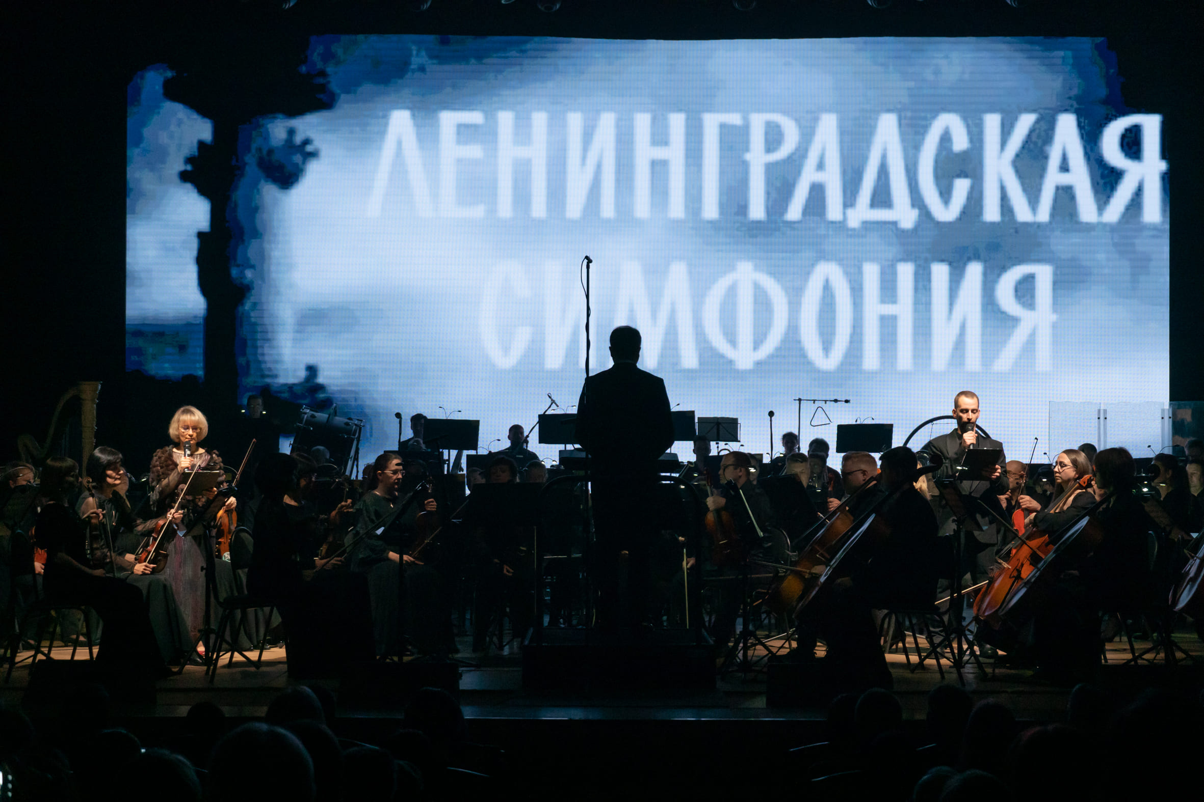 Второй вечер состоялся в Большом зале Томской филармонии, где «Ленинградскую симфонию», уже как написано композитором, целиком сыграл оркестр. Эта часть диптиха получила название «Шостакович. Седьмая. Концерт-действо». В качестве ведущей выступила инициатор этой мегаакции директор филармонии Наталия Чабовская. Кандидат искусствоведения, музыковед (выпускница Новосибирской консерватории), она стала и музыкальным руководителем спектакля (подбирала фрагменты из симфонии, работала с музыкантами), и очень артистично, с искренним порывом представила зрителям фактологию создания симфонии – вместе с ней в парном конферансе выступил режиссер Томской филармонии, еще недавно артист, танцовщик современной труппы театра Камерного балета «Москва» Илья Карпель.