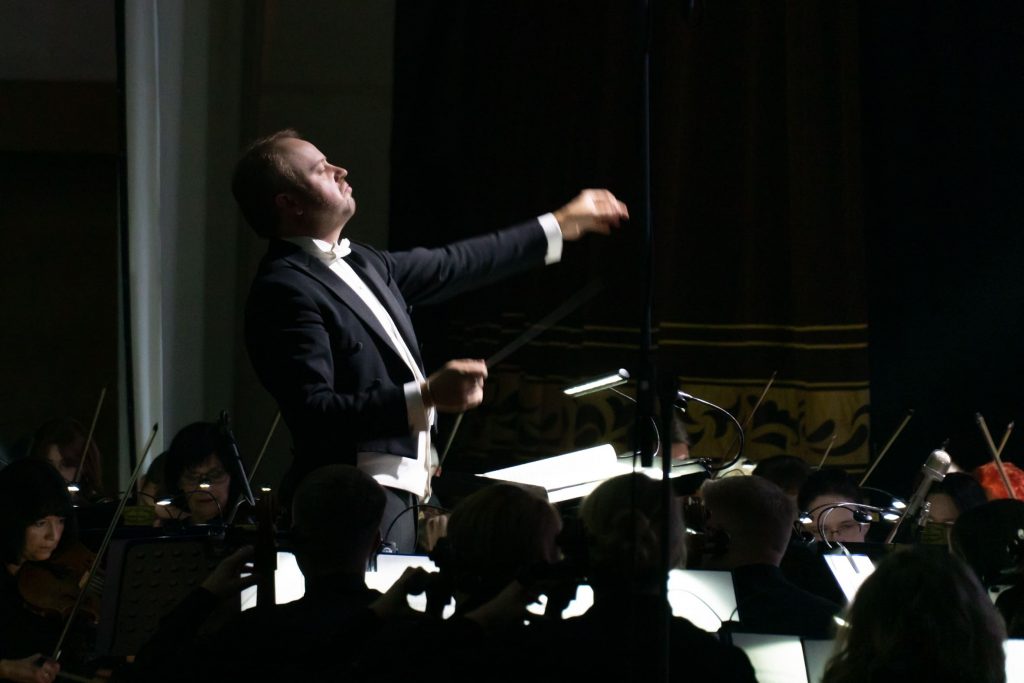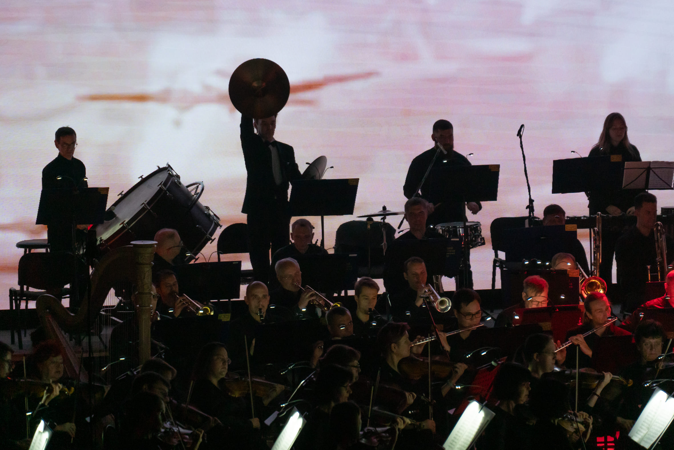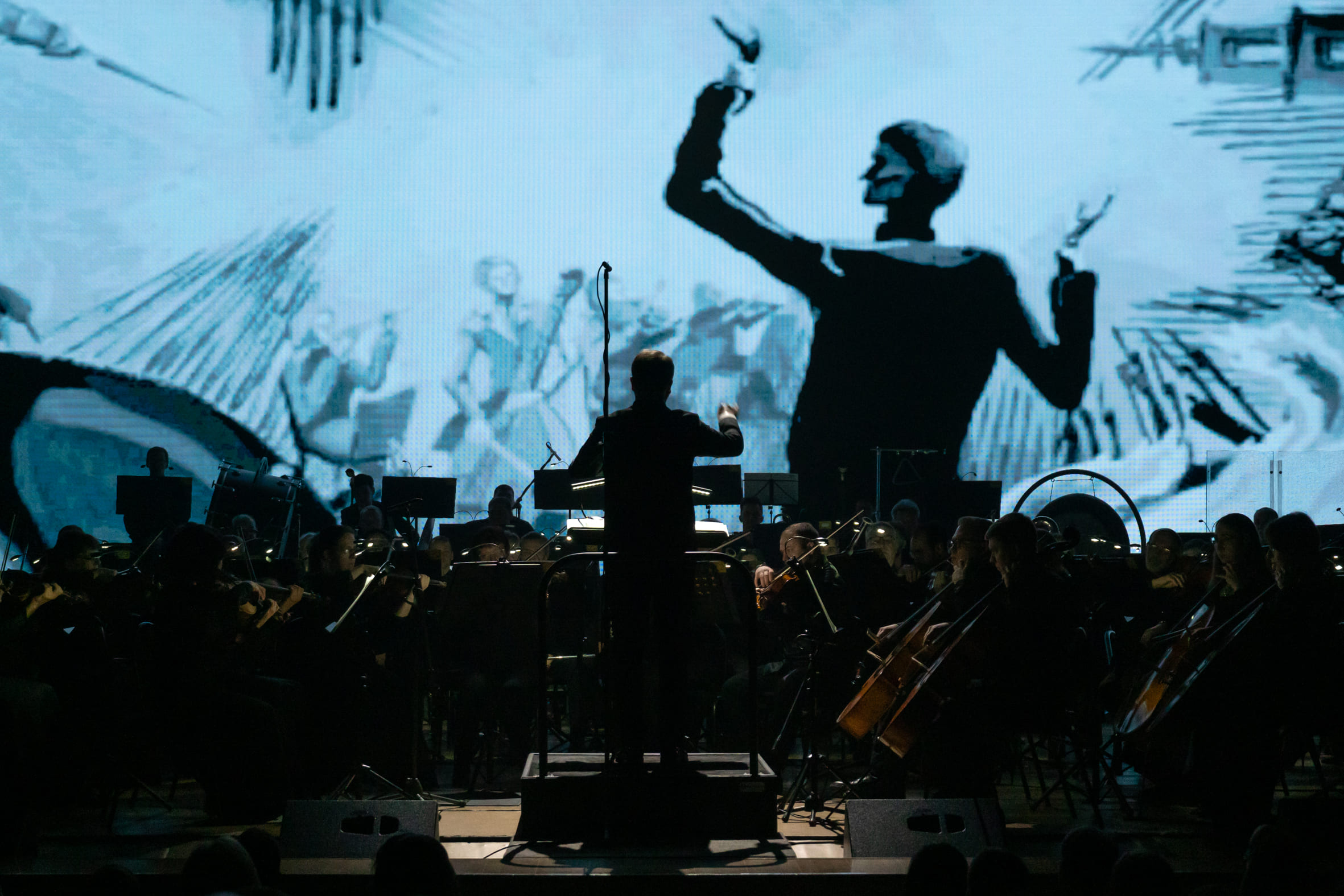 Симфонический оркестр Томской филармонии под руководством своего главного дирижера Игоря Берендеева был в едином ключе с видеорядом. Однако чувствовался особый кураж музыкантов, их желание сыграть как можно лучше, выразительнее, что проявлялось в многочисленных соло духовых, в трепетных фразах струнных, в наступательной мощи медных. Разработка – знаменитый «эпизод нашествия» – начался затаенно, но смена «картинки» и появление военной хроники, парада в Берлине ясно «сигналило», как дальше развернутся события. Дирижер удачно выстроил линию нагнетания, очень постепенно вводя музыкальную артиллерию. Это дало возможность максимально выстрелить в кульминации, которую маркировала также световая партитура. Реалистичные видео уступили место световым лучам, бившим словно прожектора ПВО. А затем полетели белые птицы, напомнившие о лебедях Непрядвы из известного советского мультфильма про Куликовскую битву. Впрочем, ассоциации тут могли быть всякие – в этом и заключалась, скорее всего, идея создателей проекта: разбудить не только эмоции, но и воображение слушателей. Ведь представления об Армагеддоне у каждого свои.