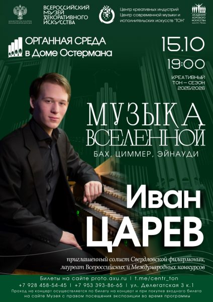 15 октября 2025 года в Центре «ТОН» на площадке Всероссийского музея декоративного искусства – новое событие в рамках цикла «Органные среды в Доме Остермана»! Иван Царев, блистательный молодой органист, приглашенный солист Свердловской филармонии, лауреат Всероссийского конкурса органистов и Международного конкурса органистов имени М. Таривердиева, концертирующий по всей России, представит программу «Музыка вселенной: Бах, Циммер, Эйнауди».