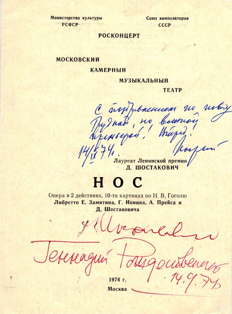 Работу над этой юношеской оперой композитора Б[орис] А[лександрович] [Покровский] начал еще на своем курсе в ГИТИСе, поставил несколько сцен, а потом решил ставить ее целиком в Камерном театре. Партитура ее, можно сказать, сверхсложная, и для оркестра, и для вокалистов. По этой причине солисты всех театров отказывались ее петь, заявляя, что партии просто невозможны. А наши молодые певцы этого не знали, спокойно выучили свои вокальные партии и непринужденно их исполняли. На одну из спевок Б. А. привел [Геннадия] Рождественского. Когда тот услышал, как Акимов с Пекелисом и Анисимова с Уколовой поют квартет из второго акта, он согласился стать музыкальным руководителем будущего спектакля. Работа над ним пошла еще интенсивней. Вообще-то, эту постановку начинал Николай Кузнецов (он таким и значился в первой программке), но, включившись, Б. А. кардинально ее переработал и создал совершенно новую, полностью свою версию. Б. А. назначил и меня в постановочную группу; помогал я в репетициях массовых сцен. Их в «Носе» много, и Б. А. ставил их виртуозно, особенно интермедии между картинами. Я не переставал восхищаться его неистощимой режиссерской изобретательностью, выразительностью мизансцен и, главное, верностью, «родству» их партитуре Шостаковича. Когда начались оркестровые репетиции, в театр стал приезжать Дмитрий Дмитриевич. Он был уже серьезно болен, плохо ходил… Его машина, с Ириной Антоновной за рулем, заезжала во двор, артисты на руках вносили его в наш подвал. Перед ним ставили пюпитр, жена клала партитуру и зажигала свечку. Дм. Дм. не переворачивал листы, но за секунду до вступления солиста или инструмента поворачивал свой острый носик в его сторону. Через тридцать пять лет он помнил каждый такт своей многосложной партитуры! В перерывах мы – Покровский, Рождественский, дирижеры, ну и, конечно, я – собирались вокруг композитора, забрасывая его вопросами и жадно ловя его скупые ответы. Он был очень немногословен и чрезвычайно деликатен. Видно было, что ему очень нравилось режиссерское решение Покровского, игра артистов и оркестра. Пожеланий он никаких не высказывал. Впрочем, однажды он извиняющимся тоном сказал, что в ленинградской премьере у Самосуда артист, игравший Ковалёва, пытаясь приставить нос, пел фразу «Ну же, полезай, дурак!» на октаву выше, в теноровой тесситуре. «Но это совсем не обязательно!» – поспешно добавил Шостакович. Конечно, наш Акимов, блестяще игравший и певший труднейшую партию Ковалёва, немедленно воплотил это в жизнь и при повторении сцены легко взял теноровое ля. Каждая встреча или короткий обмен репликами с Шостаковичем оставляли у меня глубокое впечатление. Он был не только совершенно гениальный музыкант, но и Личность, потрясающая своими человеческими качествами. Репетиции шли полным ходом, привезли лаконичные, но выразительные декорации художника Владимира Талалая, артисты примеряли костюмы. Но… однажды утром мы обнаружили печать на служебном входе: пожарные все-таки закрыли наш подвальчик. В предписании о закрытии было приведено множество причин, по которым театр вообще нельзя было открывать. Мы бросились спасать театр… Куда только ни писали, куда только ни обращались – все было бесполезно.