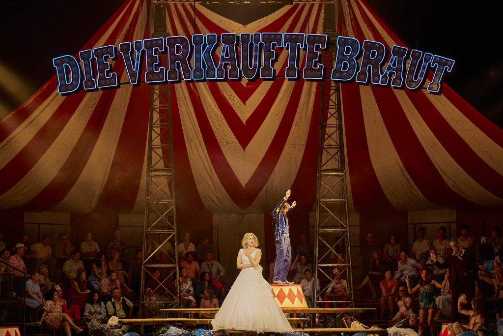 Народные гуляния в пасторальной чешской деревне переносятся в современный парк развлечений (бурное любовное свидание Маженки и Еника происходит в кабинке с неоновой надписью Love Rodeo), а приезд цирковой труппы с цыганкой Эсмеральдой (в нее влюбляется непутевый Вашек, назначенный Маженке в женихи) позволяет все третье действие провести прямо на арене, посреди жонглеров, акробатов и метателей ножа (декорации – Роберт Швер). Жаркую кульминацию комедийной драмы с участием всех родственников, втянутых в это матримониальное разбирательство, один из акробатов так и представляет уважаемой публике – табличкой «семейный цирк». В итоге, конечно, коллизия успешно разрешается, зрители ликуют, и возлюбленных ждет хеппи-энд с конфетти и фейерверком. Остается лишь легкий осадок от того, что не только родители невесты затеяли всю эту историю купли-продажи, но и азартный жених в блестящем пиджаке легко играет чувствами своей любимой, ставя на Маженку, как на трофейный приз, в своей хитроумной комбинации.