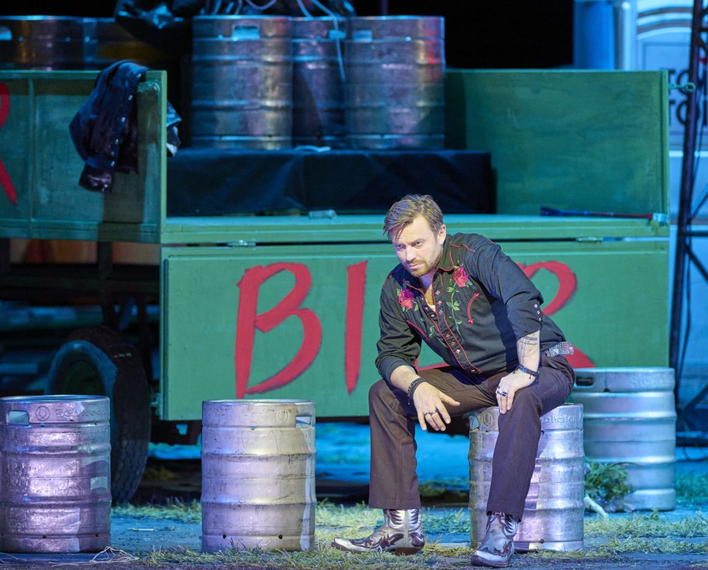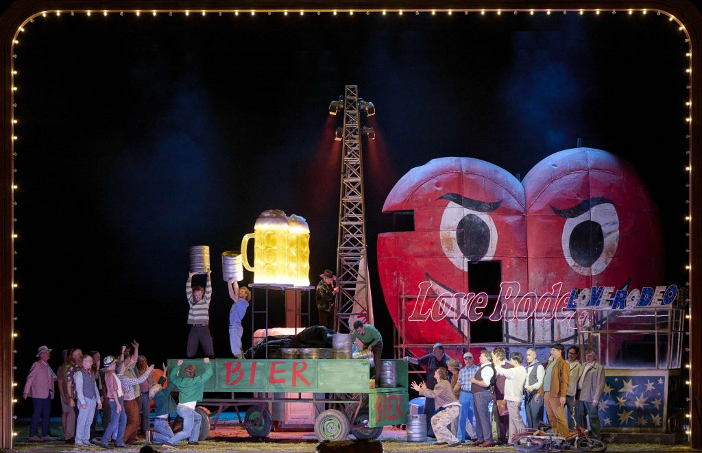 Вот в этой-то парадигме балансирования между желанием совместить аутентичную прелесть непритязательной оперной комедии с чуть более ироничным взглядом на дистанции, предъявить национальный колорит (музыкальный руководитель – чешский дирижер Томаш Ханус) и черты узнаваемой действительности (место действия – народный праздник в духе Октоберфеста с аттракционами, уличными туалетами, пряниками, сосисками, гигантскими тюбиками горчицы и, конечно, бочками пенного пива) и был задуман новый спектакль. В одном из предпремьерных интервью режиссер Дирк Шмединг рассказывает о том, что «Проданная невеста» была самой первой оперой, которую он ребенком увидел в театре. И, несмотря на желание стряхнуть с этой истории картонно-музейный налет, ему было важно передать то радостное чувство пенящегося праздника, запомнившееся с детства. Судя по смеху в зале, ему это удалось.