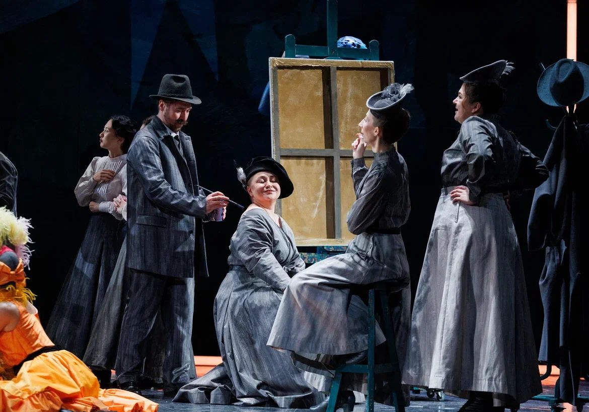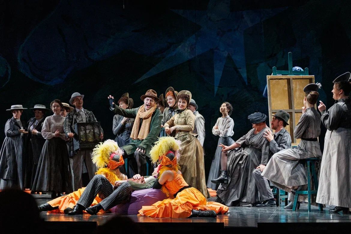 Кирилл Шмаков написал новое либретто, отчасти избавившее драматургию от ряда запутывающих узлов ради скорейшего движения к финалу, который получился двойным, произведя эффект бонуса в виде еще одного маленького спектакля с полным хеппи-эндом. Финал-обманка нешуточно закрыл занавес, возмутив несправедливостью, когда Виолетта, безнадежно влюбленная в художника Рауля, осталась совсем одна, словно сбитая с ног вихрем марша-тарантеллы «Карамболины» – звездного номера королевы карнавала Нинон. Справедливость восторжествовала, когда эта скромная Виолетта, она же Фиалка, внезапно заменила капризную Нинон, отказавшуюся выходить на сцену: второй финал явил новую звезду театра «Одеон», которой уже ничего не стоило заполучить в объятья красавца Рауля. Динамику спектакля с новым сценарием тем не менее тормозили разговорные сцены, несмотря на гиперстарательную игручесть «коверных» в лице богемной братии. Паясничающим своего Флоримона сделал баритон Павел Назаров, неспроста принесший театру «Золотую Маску» за роль Тонио в «Паяцах», а на роль его закадычного друга Анри пригласили фирменного каскадника Романа Вокуева из Петербургской музкомедии. Но большинство разговорных диалогов у певцов, привыкших к оперному протоколу, получались морализаторскими, поучающими. Образец работы с актерской речью неожиданно явил бас Вадим Мокин в эпизодической роли без пения, виртуозно проартикулировав пьяную речь Париджи, требовавшего выкуп за Виолетту. Не подкачал и второй бас театра Александр Ватолкин в роли судебного пристава Пискачека, легко и непринужденно отработав мизансцены в духе французской комедии.