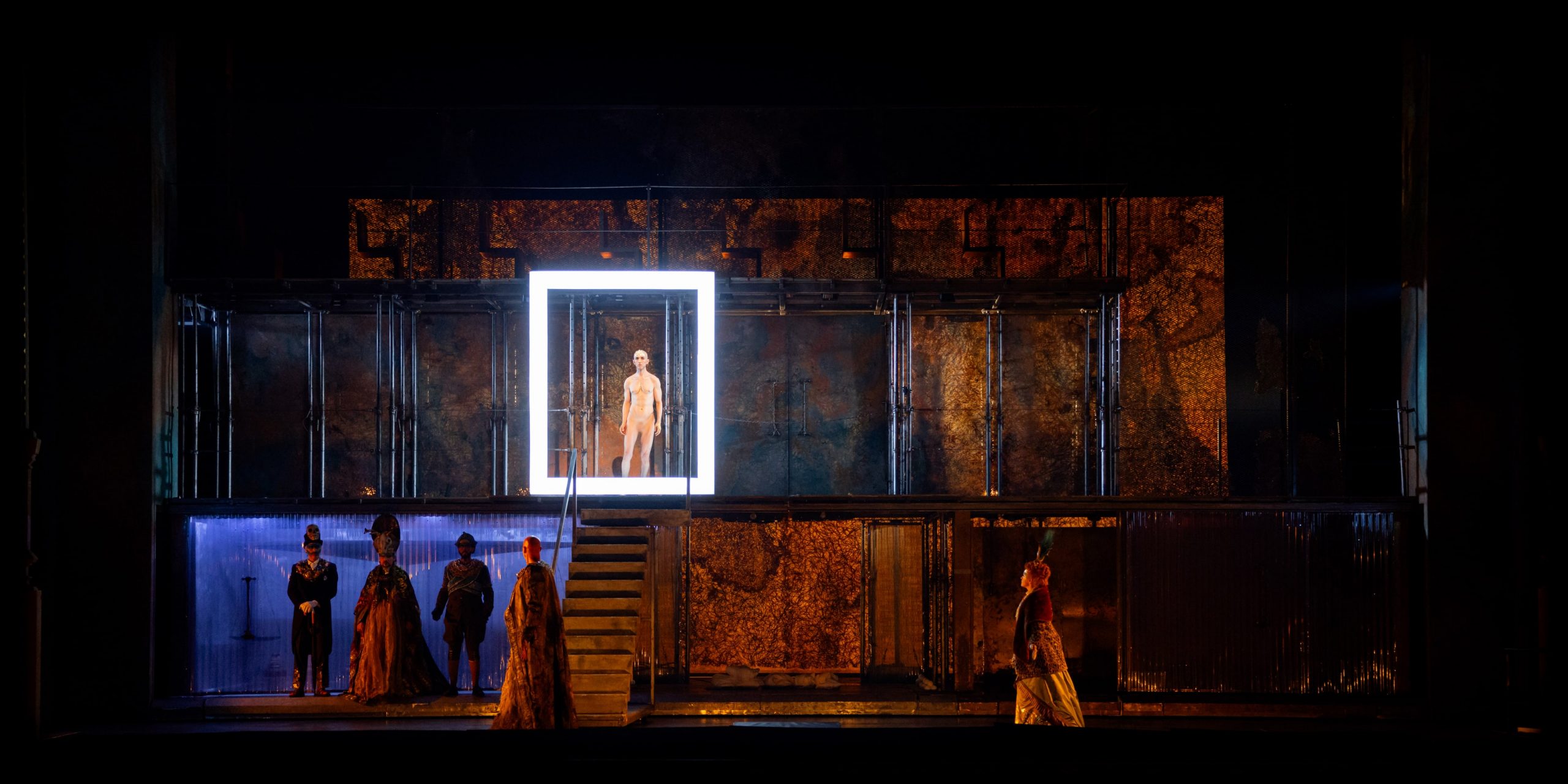 В описании спектакля на сайте Мет есть политкорректная ремарка: «Содержит момент полной фронтальной обнаженности». Эхнатон появляется на сцене в первозданной наготе, и его ритуально, «на публике» обряжают в золотой царственный наряд. Важнее слово «фронтальный» – кажется, что, подобно древнеегипетской живописи, спектакль действительно имеет только фронтальную проекцию, но отнюдь не плоскую. Основная сценическая конструкция трехэтажна, и действие в ней развивается на разных планах, персонажи между планами почти не перемещаются, кроме Эхнатона, для которого предназначены очень символические лестницы.