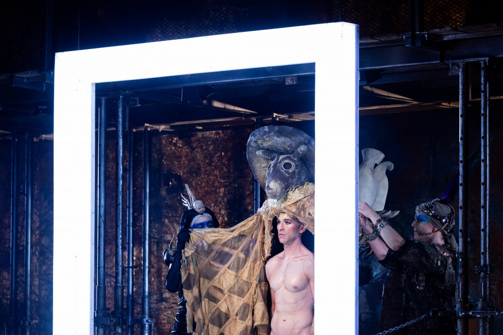 С первых тактов опера вводит слушателя в особое медитативное состояние, почти транс: классическим минималистским приемом на протяжении ощутимого по продолжительности времени в оркестре звучит один короткий мотив, чтец произносит ритуальные тексты на непонятном языке (либреттисты цитируют знаменитые «тексты пирамид» – расшифровки письмен, покрывающих внутренности пирамид, древнейший памятник древнеегипетской литературы), на тот же эффект работает и «хореография» – синхронно взлетающие в руках у жонглеров шарики буквально завораживают.