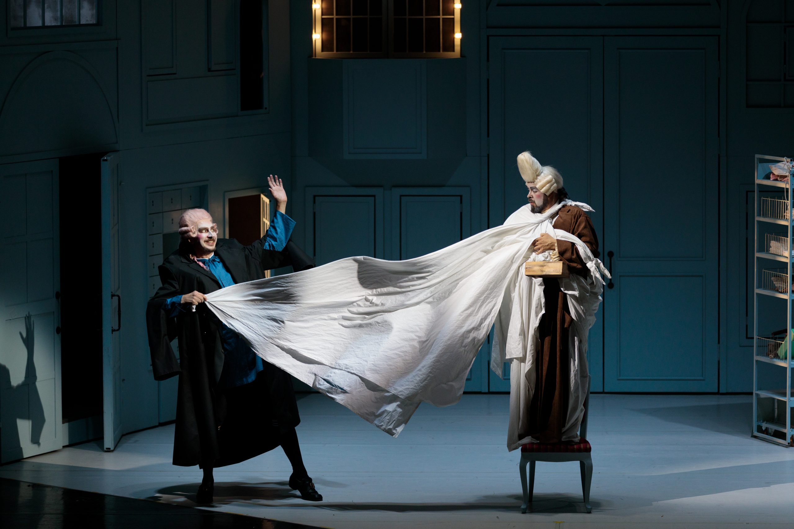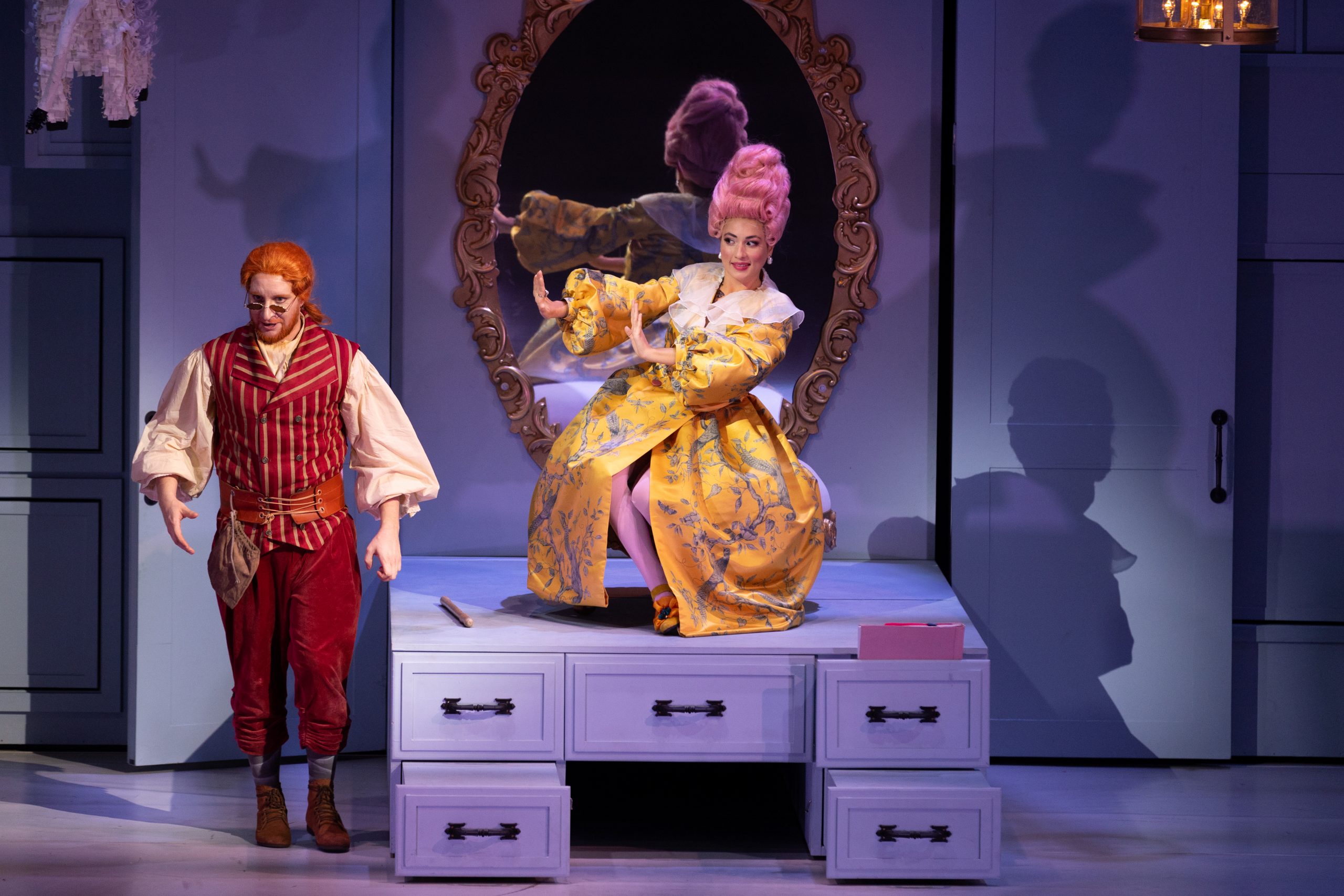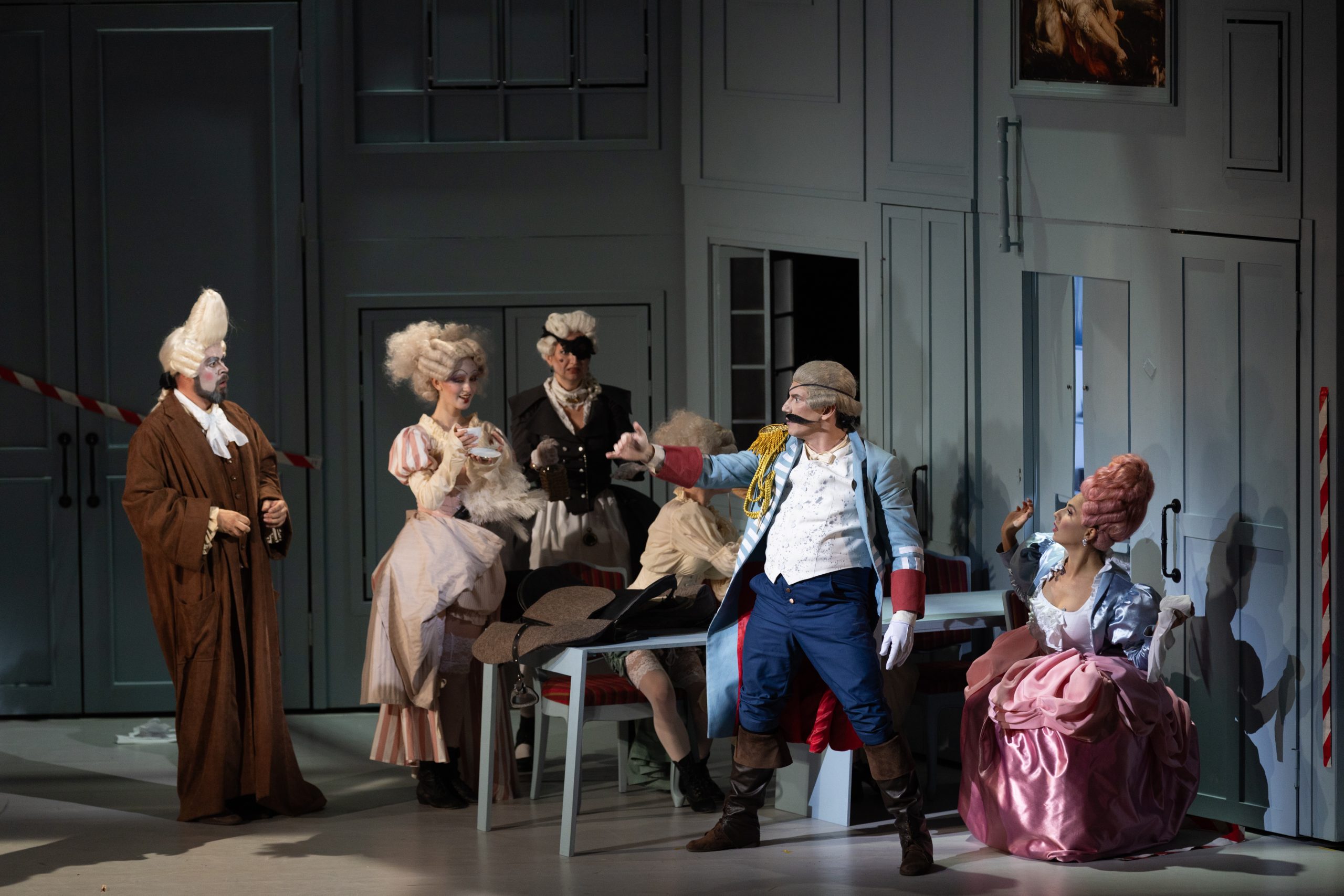 «Я впервые обращаюсь к комической опере. Это непростой жанр, ведь юмор всегда связан с конкретным моментом… “Севильский цирюльник” известен всем, специальная работа с фабулой не нужна. Главной была работа с артистами. Мне было интересно создавать игру в игре», – прокомментировала режиссер Надежда Столбова свой подход к либретто. На сцене – условный мир прошлого, где дамы ходят в кринолинах и шляпках, а мужчины облачаются в камзолы и береты. В то же время Надежда Столбова вместе со сценографом и автором костюмов Ксенией Кочубей выстраивает свою систему символов, создающих второй план истории о том, как дерзкий граф Альмавива посоперничал с доктором Бартоло и с помощью цирюльника Фигаро женился на его воспитаннице Розине. Например, некоторые события спектакля (в том числе каватина Розины) разворачиваются в прачечной, оснащенной современного вида стиральными машинами. Так метафорически обозначена тема «грязного белья», которое прячут или выставляют на всеобщее обозрение герои оперы. Есть здесь и смешная игрушечная овечка, которую время от времени показывают суетящиеся слуги (придуманные для «оживления» действия): это символ идиллических грез молоденькой Розины, мечтающей о счастье. Правда позже в пылу гнева она пробивает овечке бок, из которого высыпаются цветные лоскуты, – ее разбитые мечты. Некоторые герои особенно колоритны. Например, Дон Базилио, священник, пропевающий гимн клевете. Ему придумали что-то вроде горба – якобы он слишком много времени проводил за игрой на органе. А у мужеподобного вида служанки Берты – черная нашлепка на одном глазу, какие носят пираты. Но объяснение у создателей спектакля иное: Берта много подглядывала за окружающими, вот и поплатилась зрением…  Режиссер сделала все, чтобы наполнить рисунок каждой роли смешными деталями, а само пространство постановщики обустроили так, что выгородка стены становится то фасадом дома Розины, то, напротив, очерчивает периметр комнаты. А еще в ней то и дело открываются окошки и проемы, откуда высовываются головы любопытных слуг просцениума и подают реплики персонажи комедии. Иногда ассоциативный ряд не до конца ясен, но режиссеру хочется довериться – раз так задумано, значит, есть важный подтекст, пусть и не до конца читаемый.