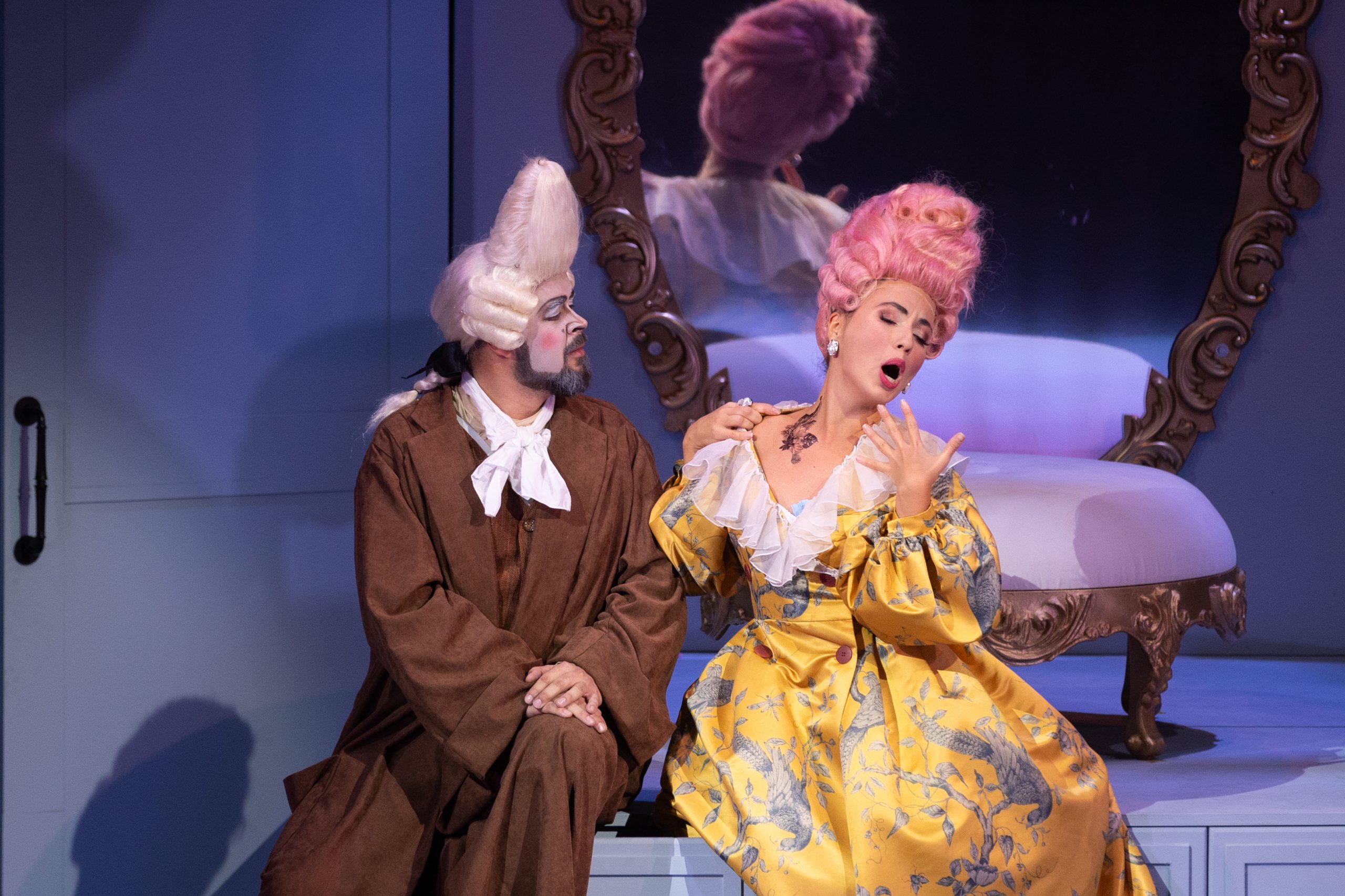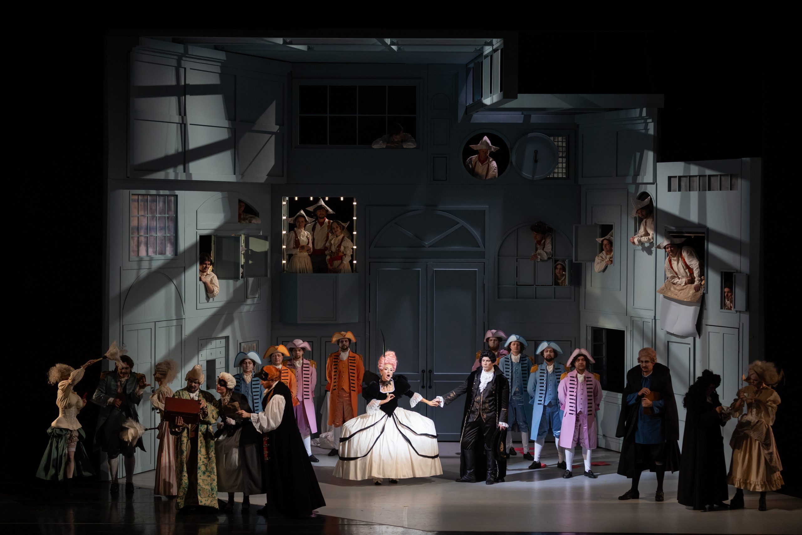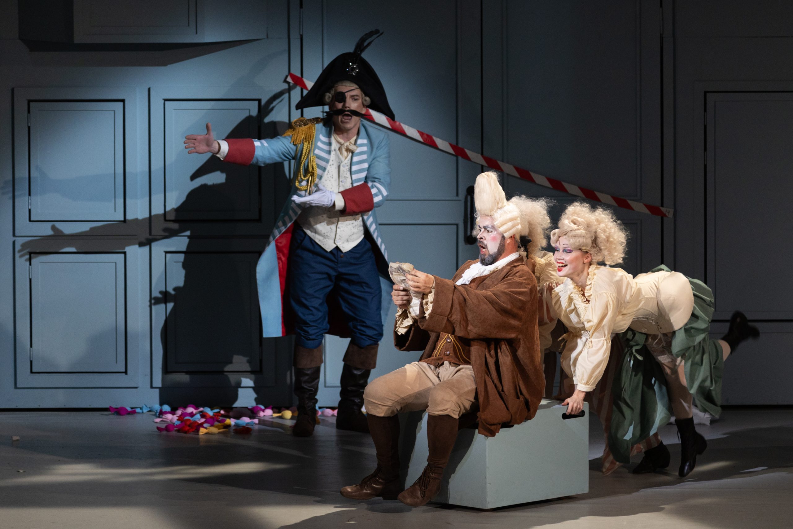 «Я впервые обращаюсь к комической опере. Это непростой жанр, ведь юмор всегда связан с конкретным моментом… “Севильский цирюльник” известен всем, специальная работа с фабулой не нужна. Главной была работа с артистами. Мне было интересно создавать игру в игре», – прокомментировала режиссер Надежда Столбова свой подход к либретто. На сцене – условный мир прошлого, где дамы ходят в кринолинах и шляпках, а мужчины облачаются в камзолы и береты. В то же время Надежда Столбова вместе со сценографом и автором костюмов Ксенией Кочубей выстраивает свою систему символов, создающих второй план истории о том, как дерзкий граф Альмавива посоперничал с доктором Бартоло и с помощью цирюльника Фигаро женился на его воспитаннице Розине. Например, некоторые события спектакля (в том числе каватина Розины) разворачиваются в прачечной, оснащенной современного вида стиральными машинами. Так метафорически обозначена тема «грязного белья», которое прячут или выставляют на всеобщее обозрение герои оперы. Есть здесь и смешная игрушечная овечка, которую время от времени показывают суетящиеся слуги (придуманные для «оживления» действия): это символ идиллических грез молоденькой Розины, мечтающей о счастье. Правда позже в пылу гнева она пробивает овечке бок, из которого высыпаются цветные лоскуты, – ее разбитые мечты. Некоторые герои особенно колоритны. Например, Дон Базилио, священник, пропевающий гимн клевете. Ему придумали что-то вроде горба – якобы он слишком много времени проводил за игрой на органе. А у мужеподобного вида служанки Берты – черная нашлепка на одном глазу, какие носят пираты. Но объяснение у создателей спектакля иное: Берта много подглядывала за окружающими, вот и поплатилась зрением…  Режиссер сделала все, чтобы наполнить рисунок каждой роли смешными деталями, а само пространство постановщики обустроили так, что выгородка стены становится то фасадом дома Розины, то, напротив, очерчивает периметр комнаты. А еще в ней то и дело открываются окошки и проемы, откуда высовываются головы любопытных слуг просцениума и подают реплики персонажи комедии. Иногда ассоциативный ряд не до конца ясен, но режиссеру хочется довериться – раз так задумано, значит, есть важный подтекст, пусть и не до конца читаемый.