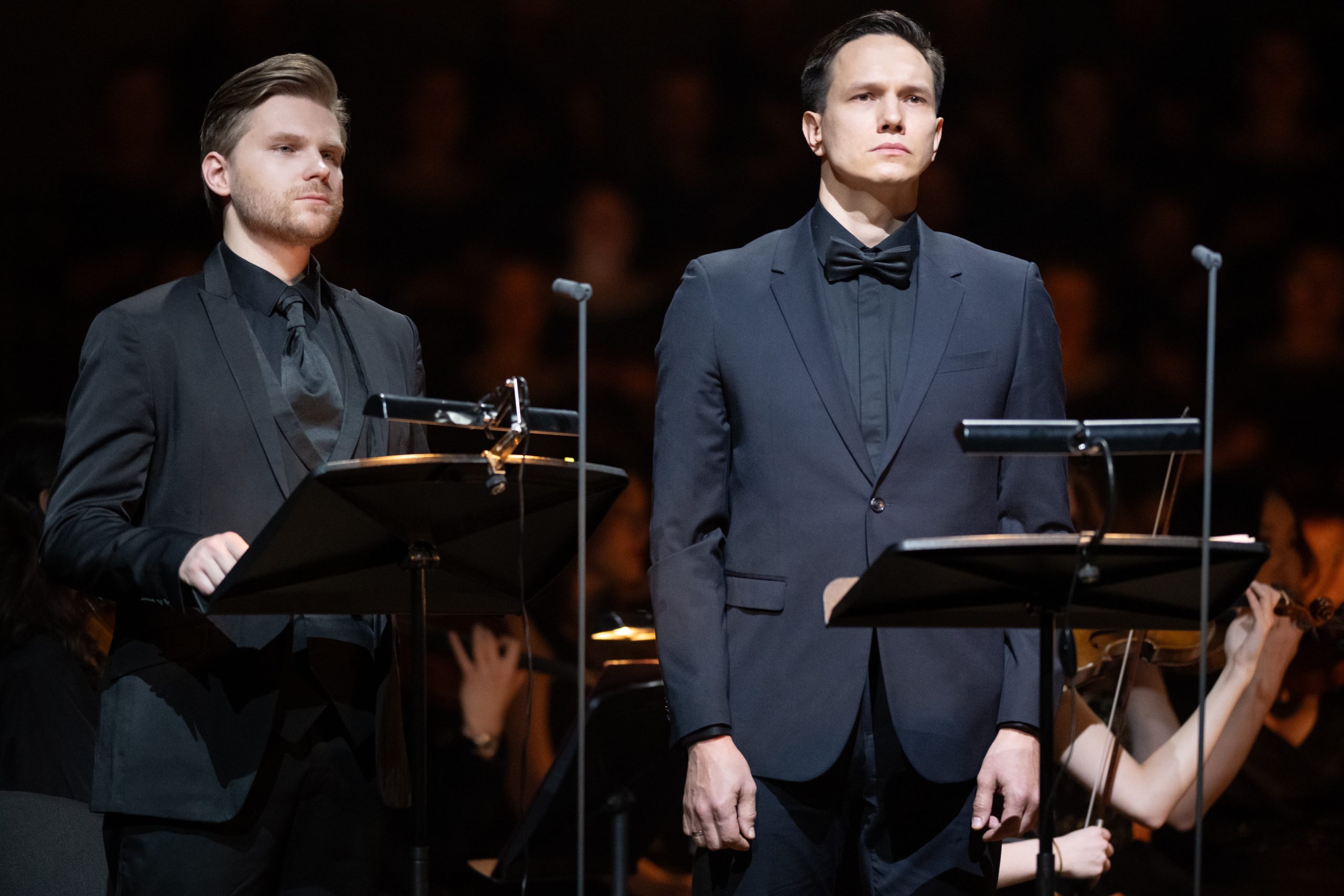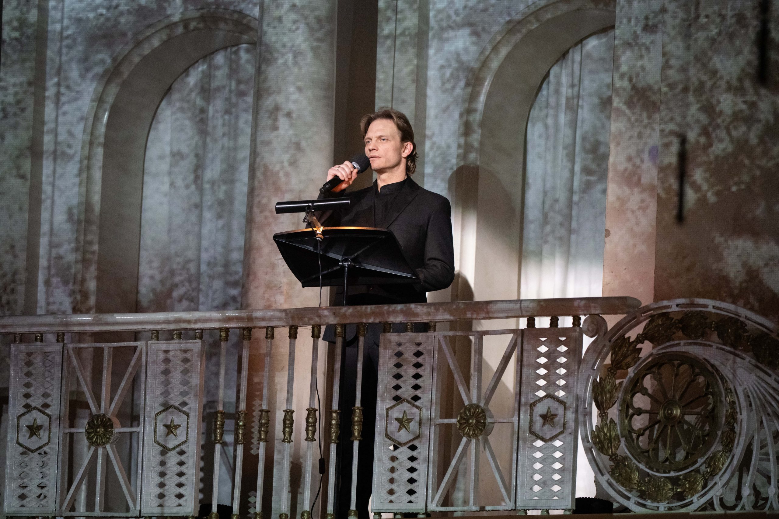 Для Валерия Воронова тема памяти – одна из самых важных: «Это форма жизни, продолжающаяся в нас». Композитор обратился к стихам поэтов-фронтовиков – Бориса Пастернака, Константина Симонова, Расула Гамзатова, Юрия Левитанского, чьи строки невозможно читать и слушать без слез. Актеры-чтецы, выходившие на балконы Зала Чайковского, декламировали их с особым пронзительным чувством, вкладывая свое отношение в каждое слово. К поэзии и музыке присоединилась и живопись – но не модный видео-арт с искусственным интеллектом, а видеопроекция картин и графики художников-соцреалистов, взятых из фондов Третьяковской галереи. Отбором визуального ряда занималась Полина Агуреева. Полотна и графика Константина Финогенова, Аркадия Пластова, Бориса Угарова, Анатолия Никич-Криличевского и других транслировались на огромных экранах по всему периметру сцены во время звучания музыки и стихов – и этот удивительный контрапункт страшной, несокрушимой силой вовлекал слушателей в свою жестокую правду.