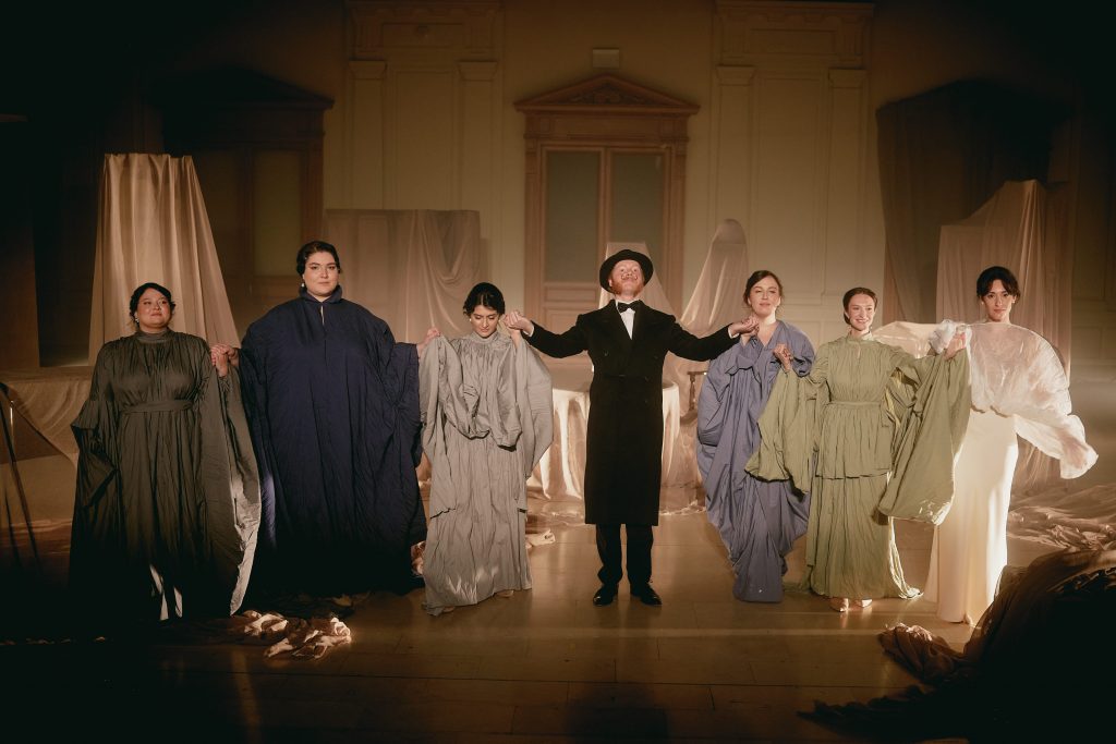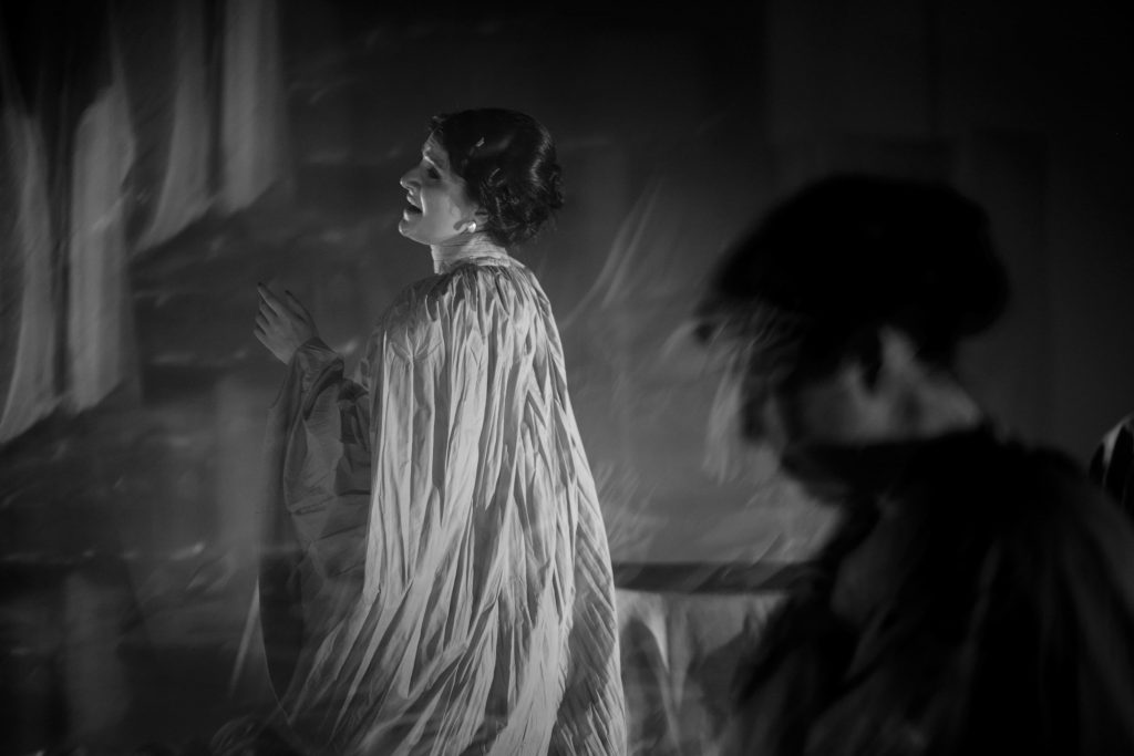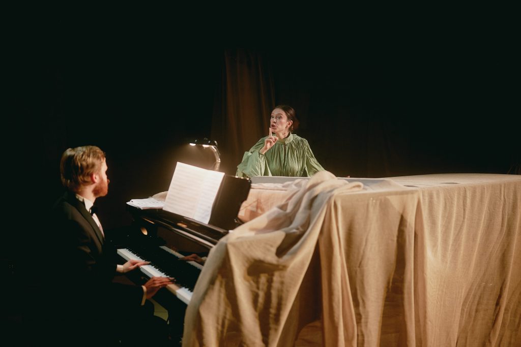 На протяжении всего действия артистки Академии в полном составе находились на сцене. Мизансцены были выстроены в антураже условной комнаты: девушки занимали место за столом, присаживались на софу, облокачивались на стену или скрывались за условной дверью. Движения их были плавны, размеренны – в этом читался некий шарм ушедших столетий. Однако сложность такого решения в том, что артистки все время должны быть в образе, невербально подчеркивая свой интерес к происходящему. Учитывая камерное пространство зала временной локации Дома Радио, каждое сценическое движение и взгляд артиста находятся под пристальным вниманием публики. В этом плане с задачей не всегда справлялась Татьяна Бикмухаметова: казалось, в отдельные моменты действие на сцене не слишком ее занимало. Зато «Гитары и мандолины» Сен-Санса она исполняла напористо и дерзко, демонстрируя подлинную увлеченность материалом, силу голоса и чистоту и яркость тембра.