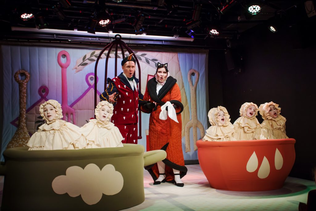 Сердцем оперы стала Татьяна Скареднева, из серого котишки со столь же морально «серой» ролью в оригинальной притче превратившаяся в устрашающую кошку. Певица умело балансировала на тонкой грани между обаятельной затейницей и злодейкой по типу волшебницы Малефисенты из одноименного американского фильма-фэнтези. Глядя на ее многозначительные улыбки, дети в зале не очень понимали, радоваться им или печалиться, что, думается, было сделано намеренно. По контрасту с ней Владимир Токарев играет боязливого и печального Скворца, сжавшегося в своей клетке. Его музыка полна протяжных, вздыхающих интонаций, которые певец убедительно передает. Воплощенные в виде двух ансамблей детей-певцов Кашка (Сергей Зырянов, Алана Хасанова) и Молоко (Александра Зырянова, Алсу Богоутдинова, Элеонора Хасанова) получили возможность порадовать публику на удивление слаженными хореографическими номерами, где они по очереди высовываются из «кастрюль» (балетмейстер Марианна Богданова). На лицах юных исполнителей только одни улыбки – трудно даже поверить, что они по сюжету ссорятся друг с другом.