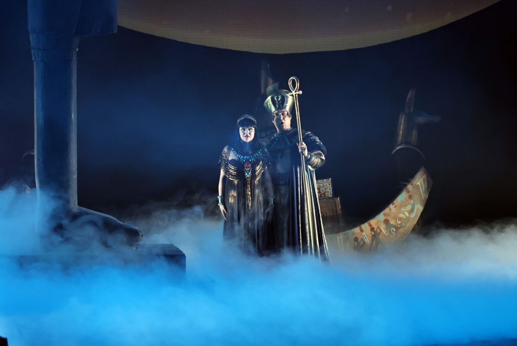 Выделена линия противостояния египтян и эфиопов: последние (также безмолвный миманс) неоднократно сопровождают Аиду и в ее грезах, как символ Родины, и наяву – как вечное напоминание о том, что она должна думать о своем народе. Занимательна сцена в покоях Амнерис, когда принцесса и ее прислужницы (женский хор) совершают обряд, держа в руках фигурки солдат, сражающихся друг с другом, и наколдовывая победу; затем на музыку танца мавританских рабов с помощью этих кукол они играют в войнушку. Нетривиально решен триумфальный марш: вместо торжественного шествия миманса здесь дуэтный номер Аиды и Радамеса. Они тянутся, но не могут прикоснуться друг к другу – на эту тему для них поставлен красивый пластический эпизод. Режиссер нам как бы объясняет: в земном мире Аиде с Радамесом не суждено быть вместе, только в царстве мертвых их души могут соединиться.