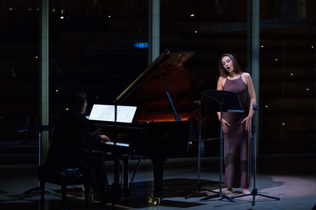 Но не будем сразу нырять в музыку с головой. Сопрано Елене Гвритишвили – не первая с сольным концертом в программе «Музыка вне себя». До этого, наряду с «Броненосцем “Потёмкин”», Брукнером и Булезом, была представлена программа пианиста Ильи Папояна, впервые игравшего в пространстве «Электростанции». С Гвритишвили ситуация чуть интереснее: для вокалистки это был первый сольник в принципе. И хотя Елене известна больше по исполнениям барочной и современной музыки, для этого выступления она выбрала репертуар, которому не раз выказывала симпатию. Концерт состоял из романтической и импрессионистской камерной музыки. Сопровождал же ее пианист Сергей Каспров, запомнившийся в первом концерте цикла очень выразительным, но на удивление отчетливым и сухим звучанием – даже на педали. И, признаться честно, было интересно, будет ли такое звукоизвлечение сочетаться с разливистым голосом певицы.