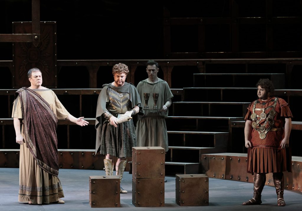 Екатерина Морозова в заглавной партии порадовала небесной чистотой, воздушностью тембра и вместе с тем его силой. Последнее качество было абсолютно уместно, когда бывший раб отца Сервилии Эгнатий предлагает девушке свою любовь в обмен на спасение Сорана. И пусть в арии «Цветы мои» Морозова выглядела несколько робко и не слишком уверенно, но дальше ее вокальный потенциал раскрывался все сильнее и сильнее, для того чтобы проявить себя в большой сцене смерти Сервилии. Здесь Морозова покоряла отрешенностью героини от мира и феноменально красивым piano: ее голос лился светлым, теплым потоком всепрощения и христианской любви. На своем месте Владислав Попов – отец Сервилии Соран – с фундаментально ровным и по-родительски теплым басом. Андрей Потатурин в роли Эгнатия пока рисует облик злодея исключительно голосом и его колючими, агрессивными интонациями, но в дальнейшем хотелось бы большей актерской свободы. Илья Селиванов, исполняющий партию жениха Сервилии Валерия, звучит несколько резковато, хотя партия предполагает и романтические, пылкие интонации молодого влюбленного. Но образу стройного римского красавца Селиванов соответствует на все сто. Запоминается Родион Васенькин – вакхически веселый, безмерно обаятельный сенатор Паконий. У этого артиста крайне фактурный, сочный и выразительный баритон. Порадовали и Тихон Горячев (Тразея), Руслан Бабаев (Монтан), Ольга Дейнека-Бостон (Призрак), Роман Шевчук (Авидий Гиспо).