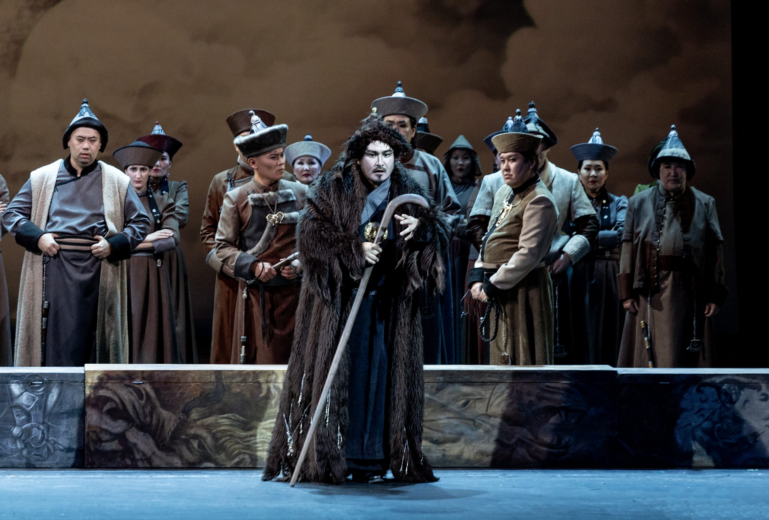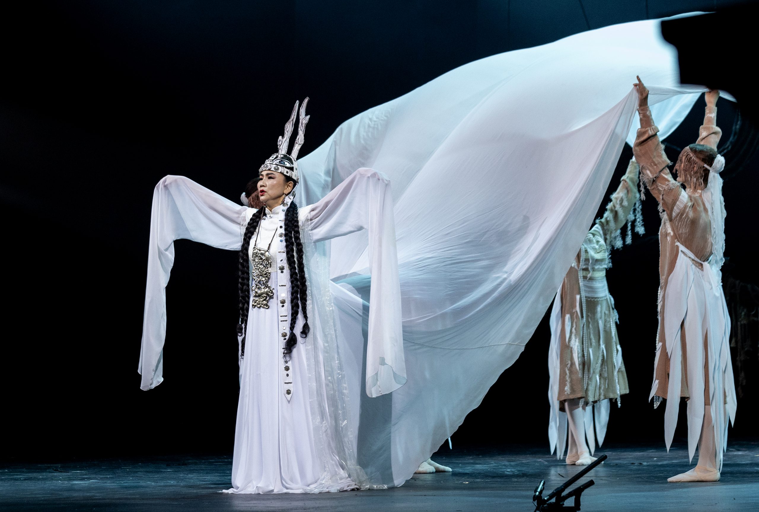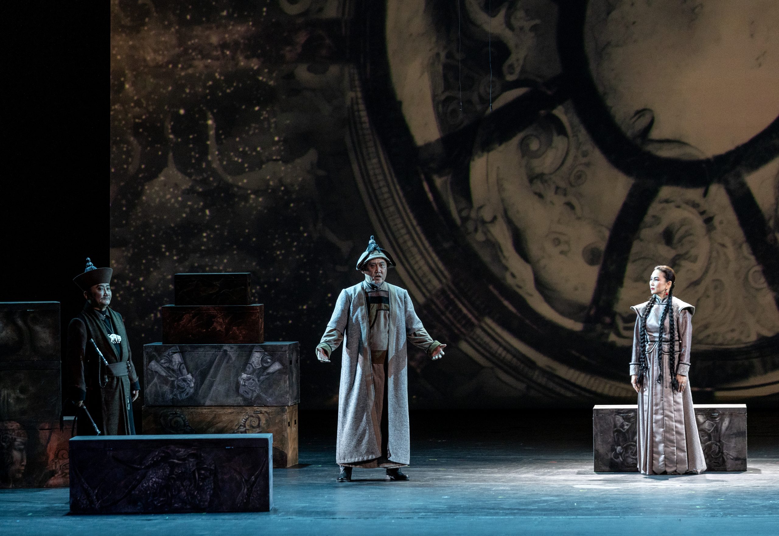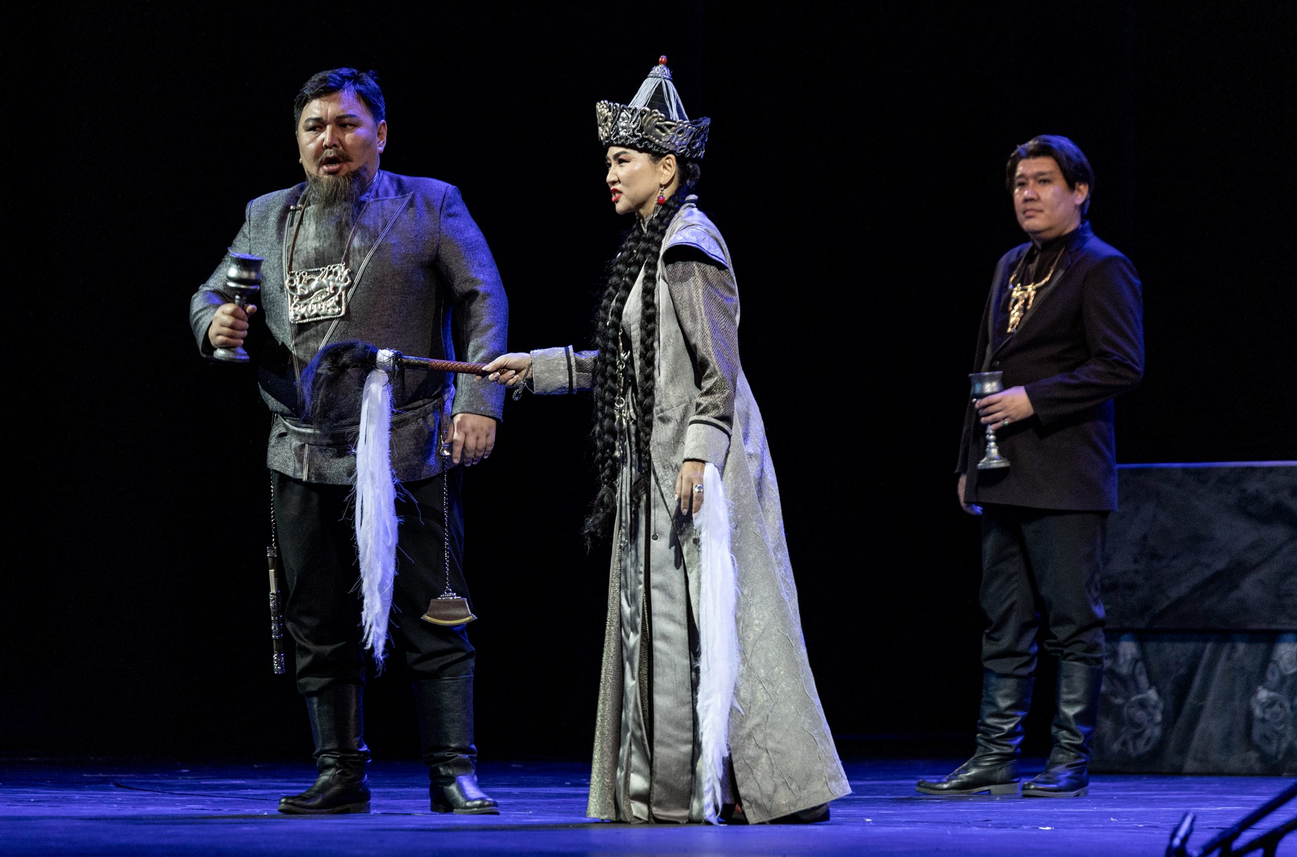 От термина «национальная опера» Дондоков открещивался во всех интервью в силу его неопределенности. Композитор просто попытался соединить традиционную оперную форму с фольклорными интонациями. Стиль пения в корне отличается от традиций академической оперы, которую московская публика может ожидать услышать. Поначалу внетональные вздохи и распевы режут слух и к ним определенно нужно привыкнуть. «Лаконичный и глубокий» бурятский язык пронизан медитативностью, которая выражена в хоровых сценах с собранием одиннадцати родов под предводительством зайсана Бадана Туракина (Александр Хандажапов).