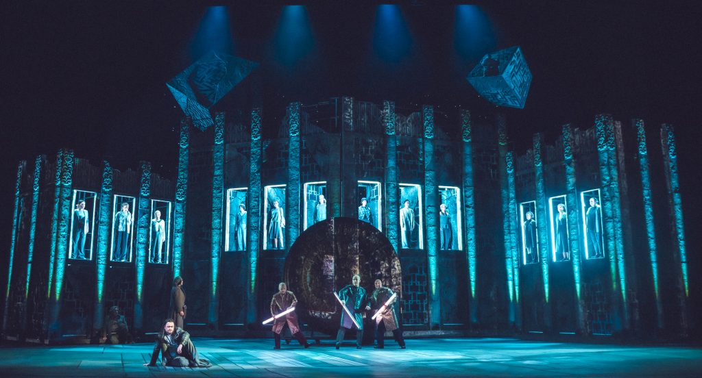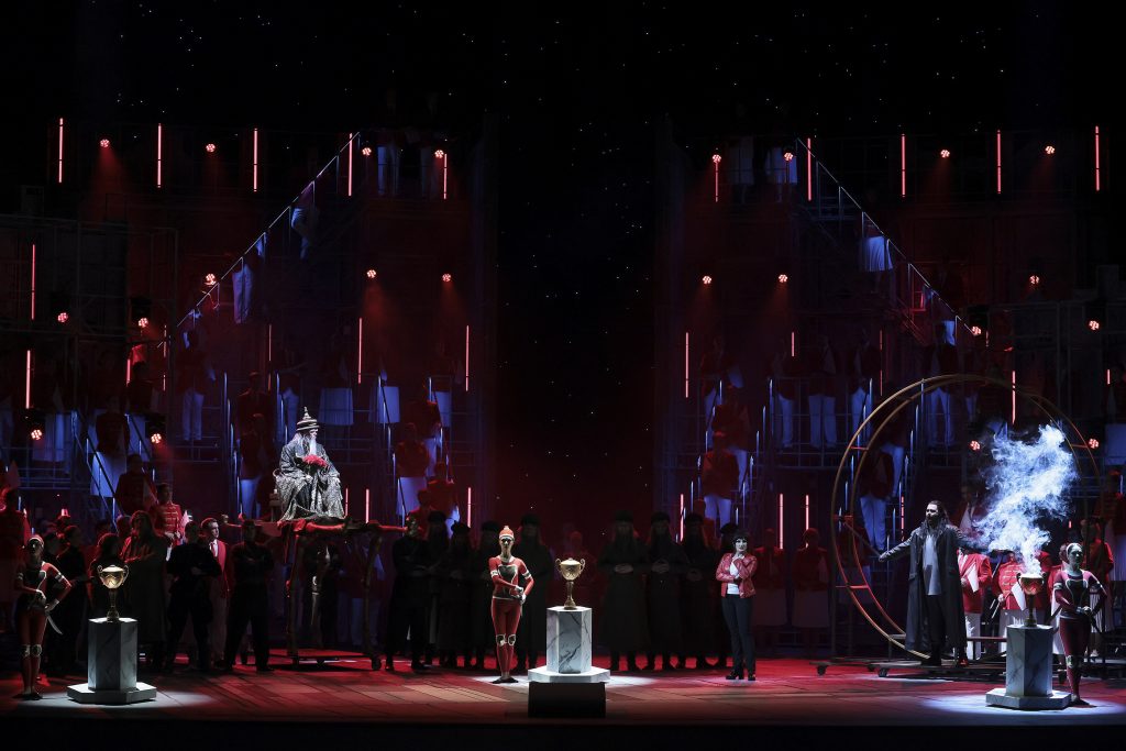 Амбициозный замысел Франдетти, при ближайшем рассмотрении даже симпатичный, в сценическом воплощении рассыпается на фрагменты. Многое остается лишь в наброске, не обретая плоти: грани так и не складываются в призму, психологические мотивы героев повисают в воздухе. Мир спектакля экспонируется, напоминая выставочный стенд артефактами. Разрывы в ткани спектакля слишком очевидны. Статичность хора в первом акте, шаблонные мизансцены в ключевых моментах (герои держат дистанции друг с другом и поют «в никуда»), а также затянутый финальный дуэт, заставляющий усомниться в целесообразности отказа от купюр, – все это смазывает впечатление.